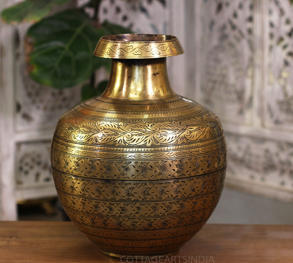 Brass Vintage Cooking Vessels converted to beautiful planters with hand etched artwork. These planters can be placed indoors or outdoors .Our collection of brass planters are perfect for adding a touch of elegance to any space. Shop our collection of unique Brass vintage planters today.