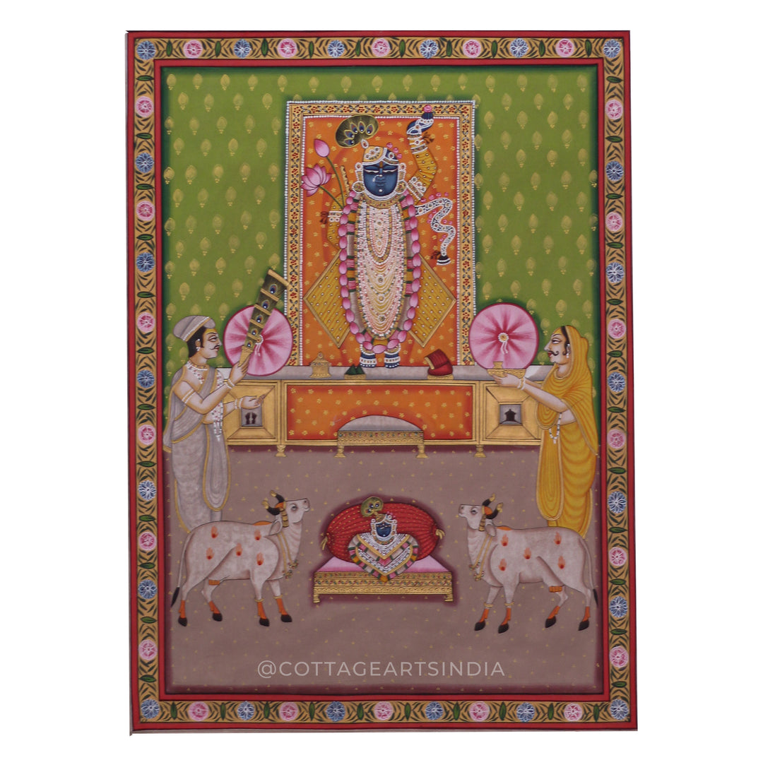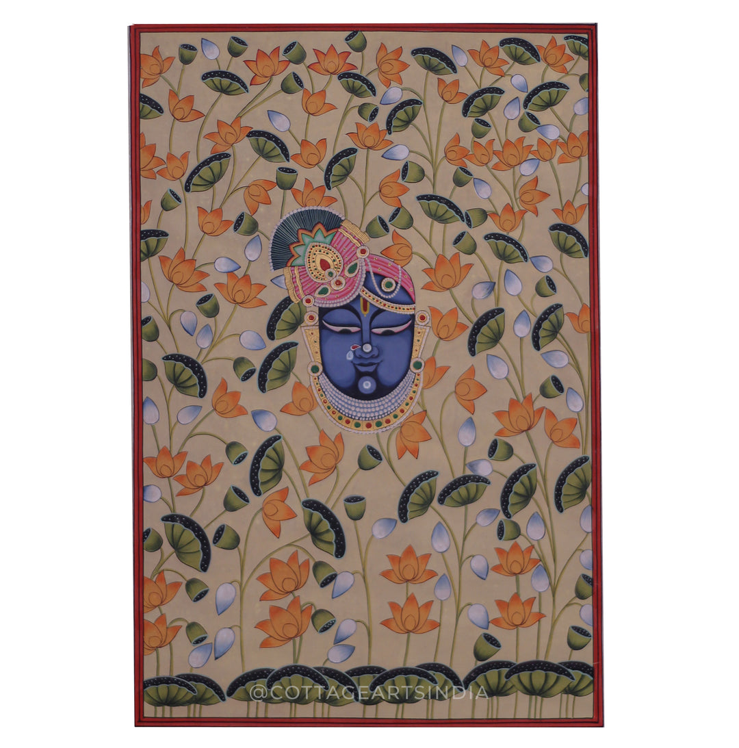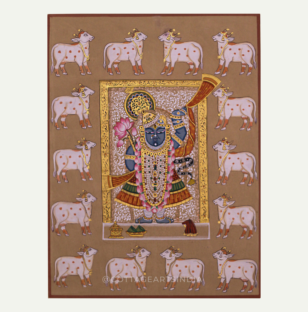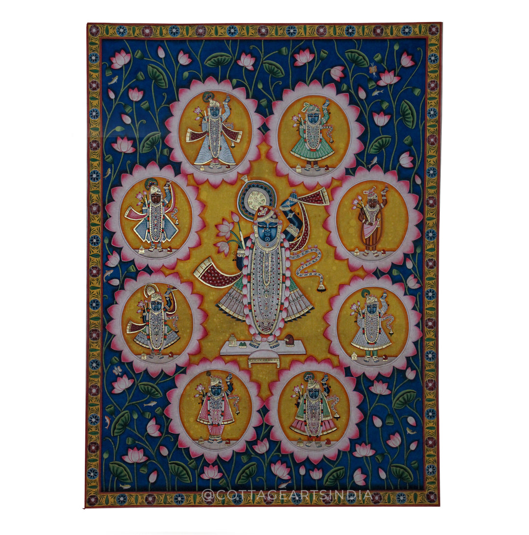 Our Indian Pichwai Painting Collection celebrates the rich artistic heritage of Nathdwara, Rajasthan, where devotion to Shrinathji (Lord Krishna) is expressed through intricate hand-painted masterpieces. Rooted in centuries-old Vaishnav traditions, Pichwai paintings were originally created as sacred backdrops for temple rituals, festivals, and seasonal celebrations.