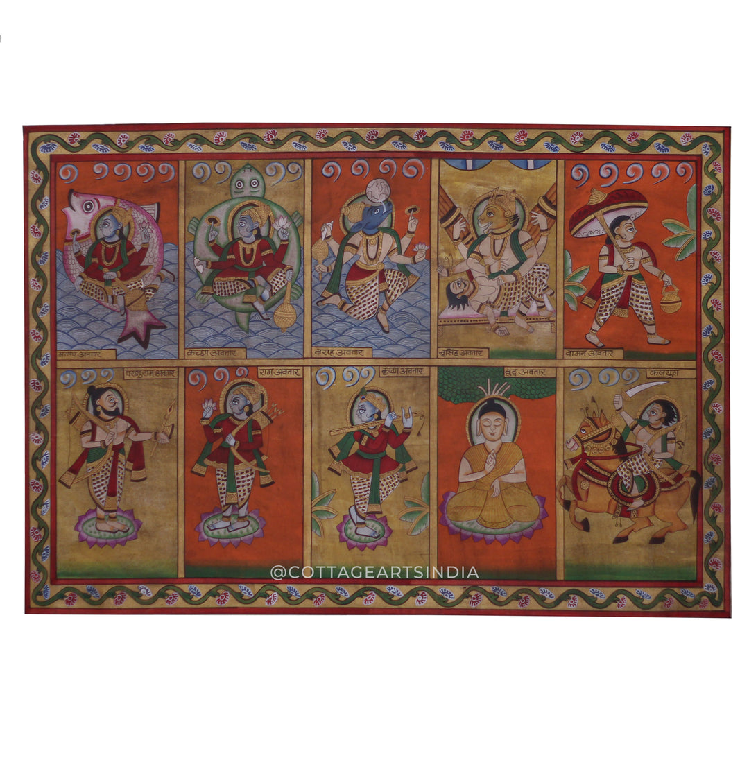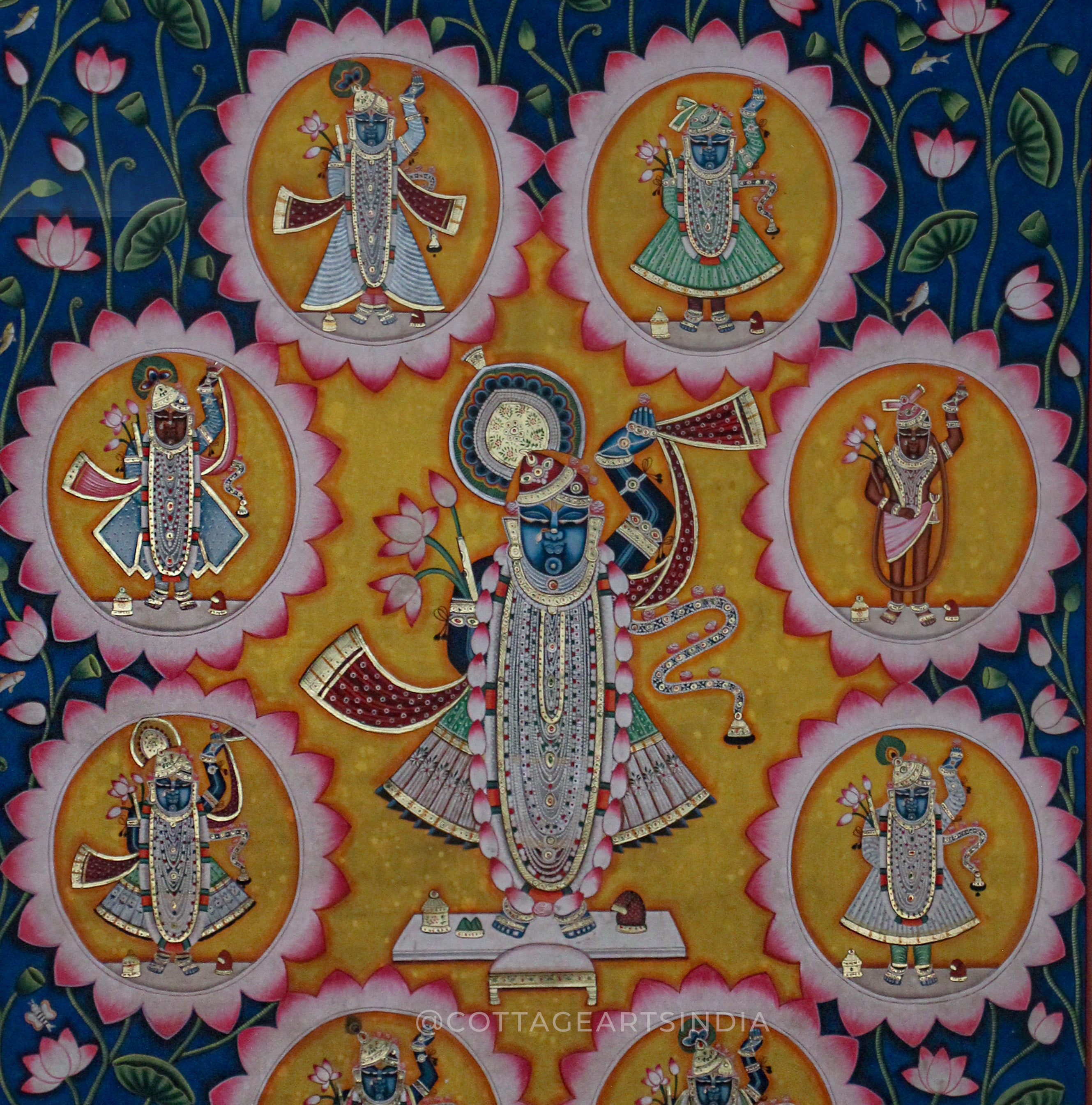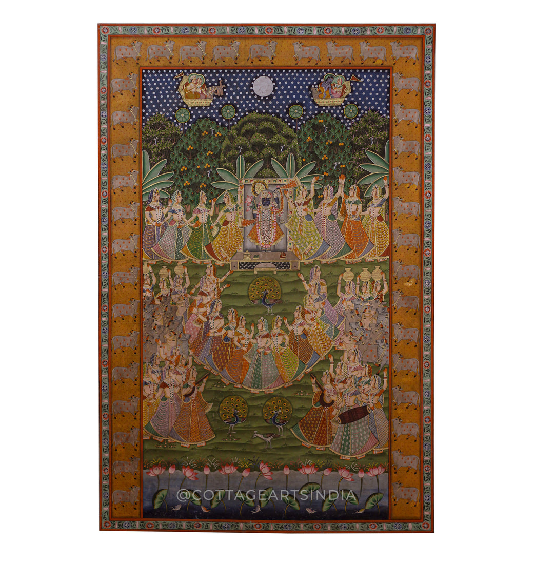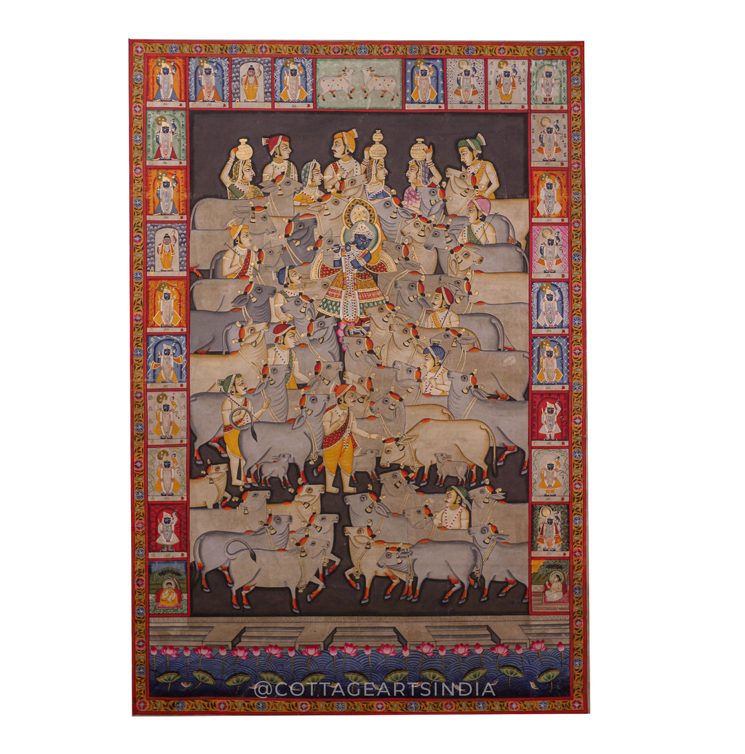 Each artwork in this collection reflects meticulous craftsmanship—featuring lotus ponds, cows, peacocks, gopis, celestial motifs, and divine leelas of Krishna—rendered using traditional techniques, natural pigments, and fine brushwork. The vibrant colors, detailed narratives, and symbolic elements make Pichwai paintings not just decorative art, but expressions of spiritual storytelling.