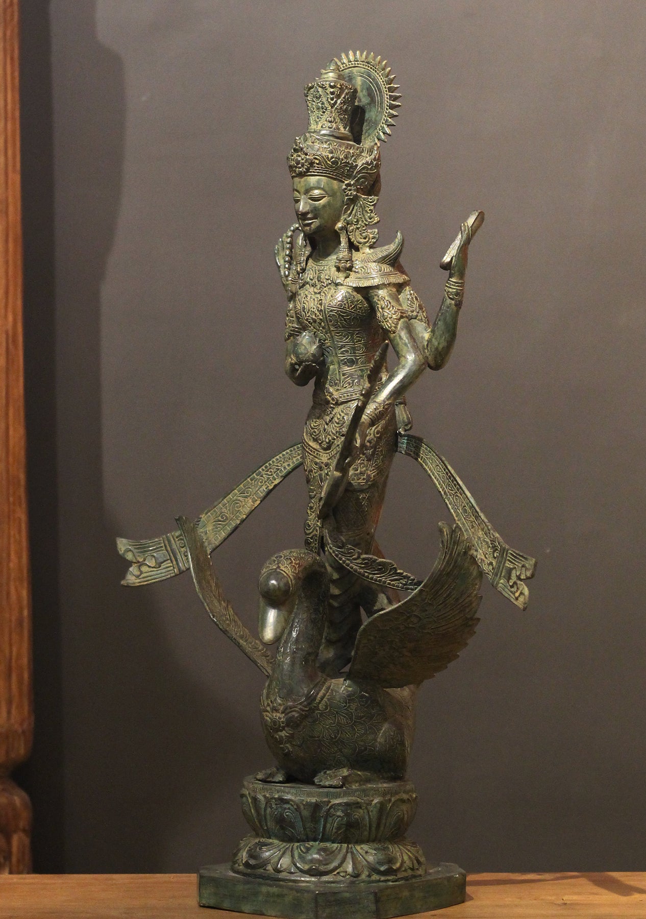This elegant bronze sculpture depicts Devi Saraswati, gracefully poised upon her sacred swan (Hamsa), holding her traditional attributes — the veena (lute) symbolizing the arts, and gestures of blessing and wisdom.