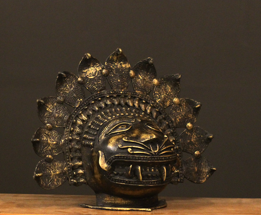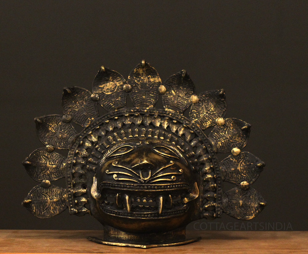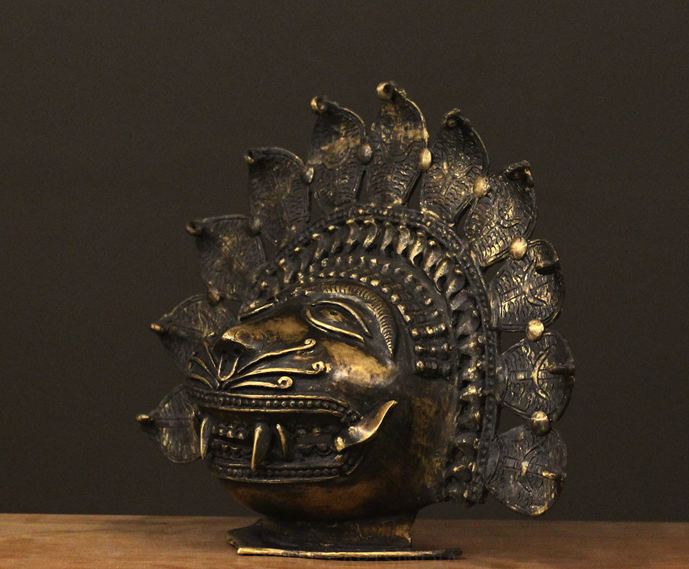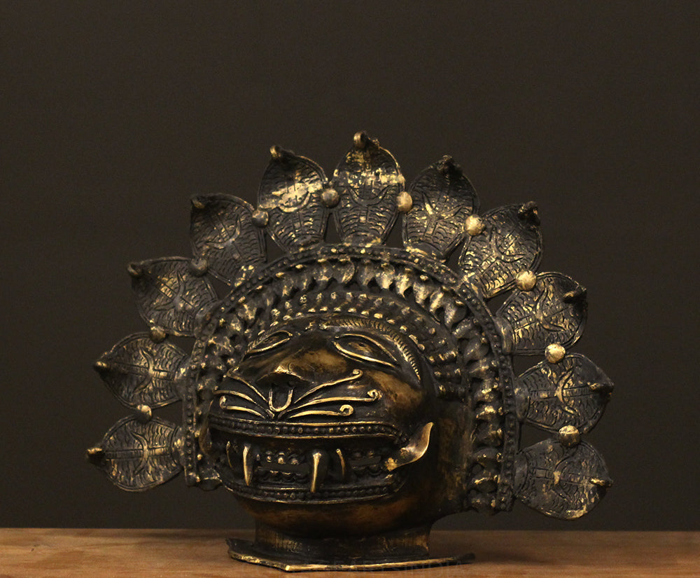 Cast in bronze, the mask is distinguished by its powerful boar-like features—flared nostrils, prominent tusks, and deeply expressive eyes that capture a sense of divine authority. The finely worked details on the forehead, ears, and elaborate headdress showcase the artisan’s mastery, while the naturally aged patina lends an authentic aura of antiquity and timelessness.