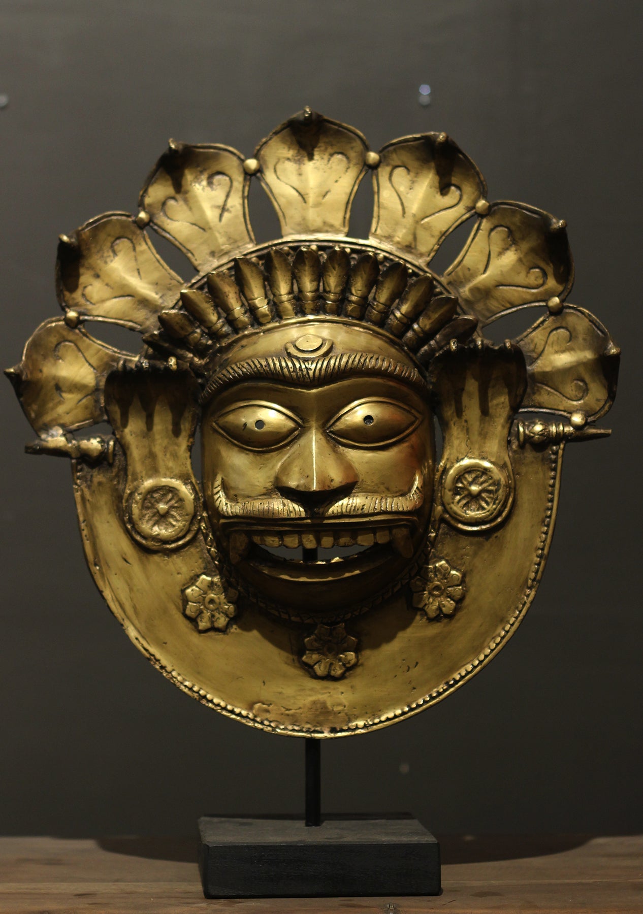 Cast in bronze, the mask is distinguished by its powerful boar-like features—flared nostrils, prominent tusks, and deeply expressive eyes that capture a sense of divine authority. The finely worked details on the forehead, ears, and elaborate headdress showcase the artisan’s mastery, while the naturally aged patina lends an authentic aura of antiquity and timelessness.
