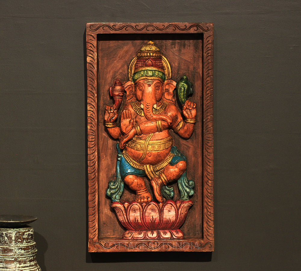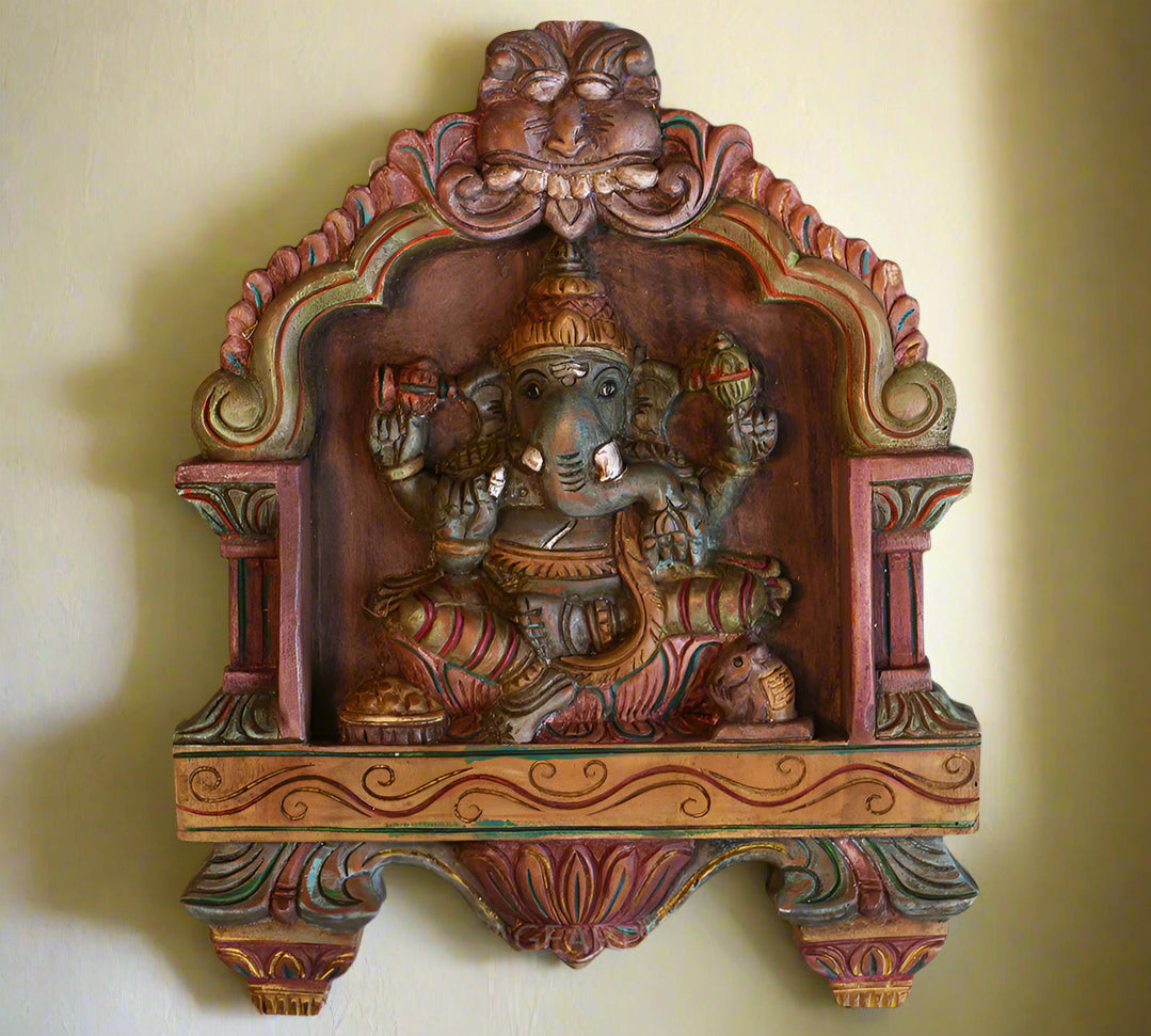Enhance your space with this handcrafted wooden wall panel featuring Lord Ganesha in a traditional South Indian kavadi frame. Finished with antique-style hand painting, it adds spiritual charm and timeless artistry to any wall.