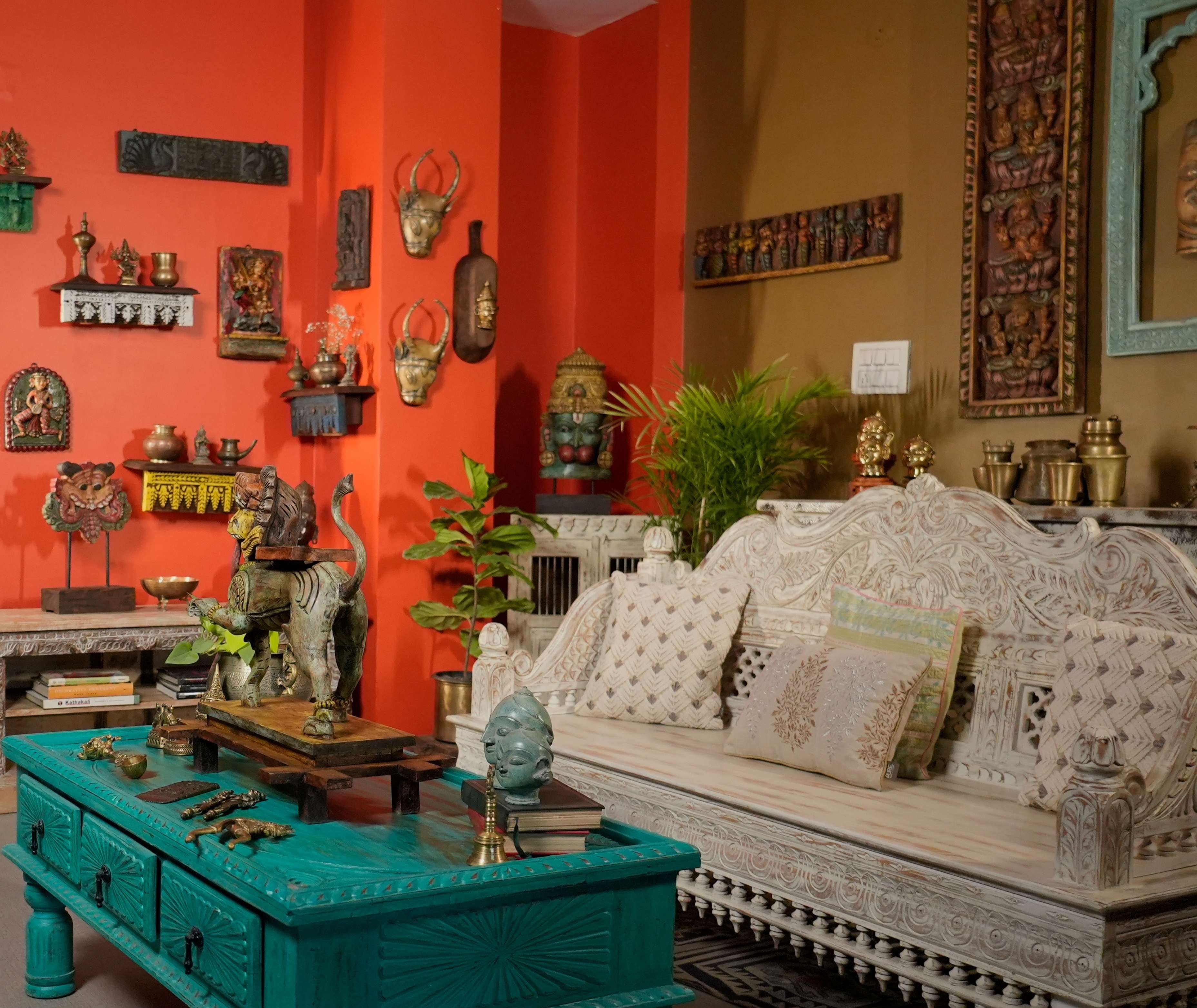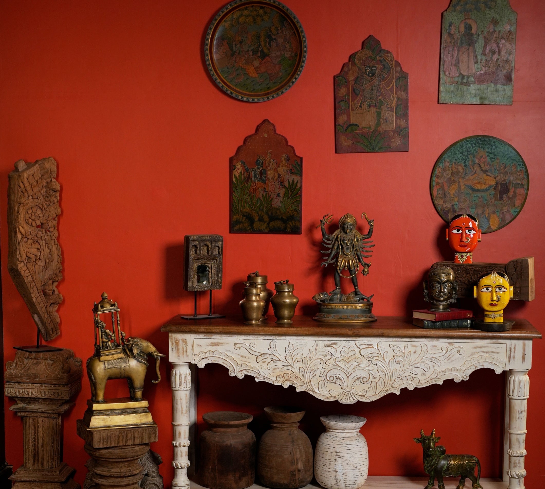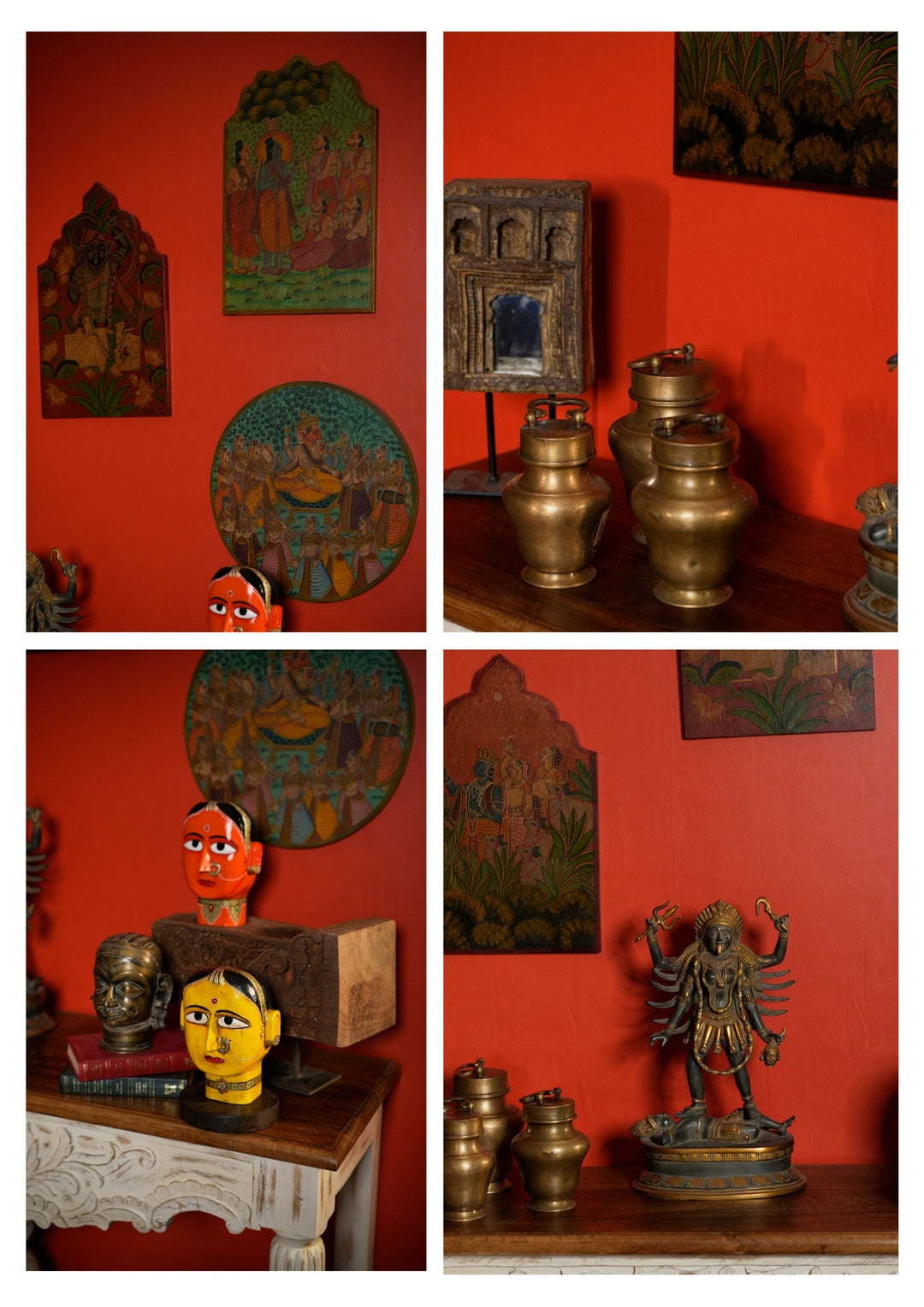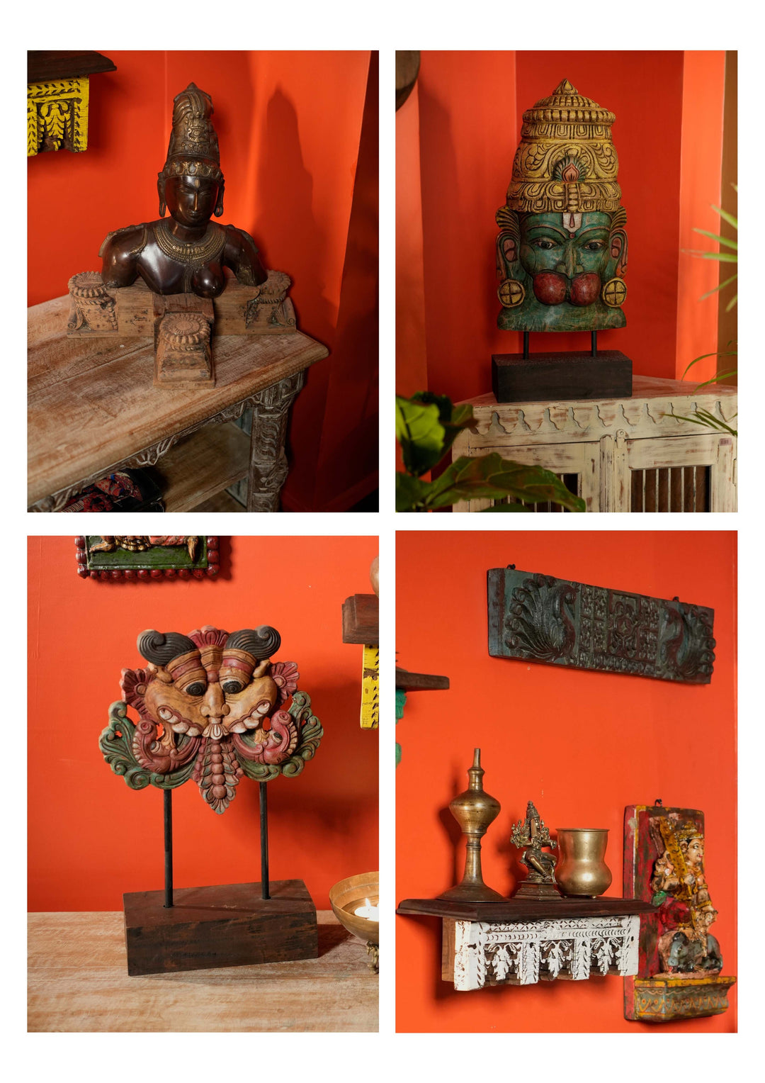 Layer hand-painted wooden panels on a bold wall color to create a striking heritage backdrop. Pair with masks or brass décor for depth.