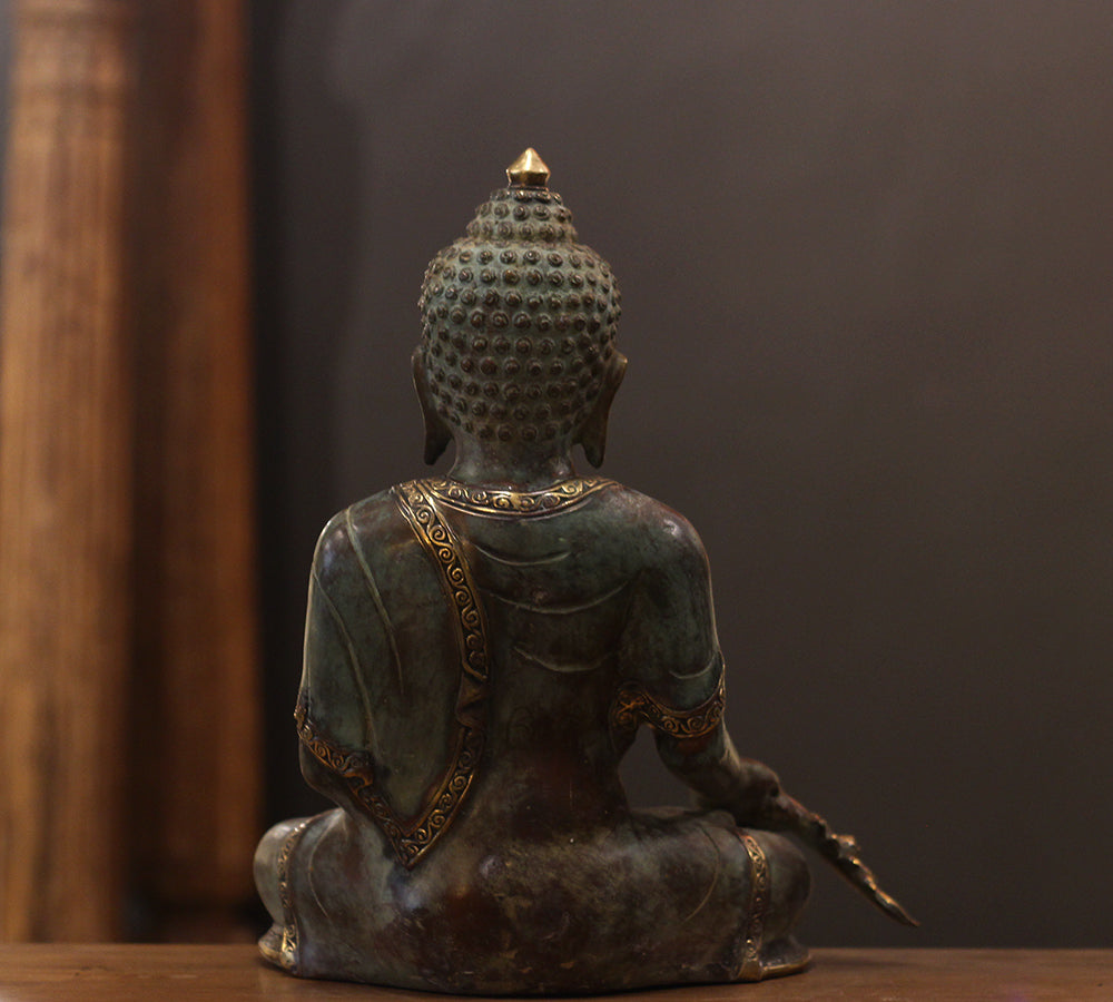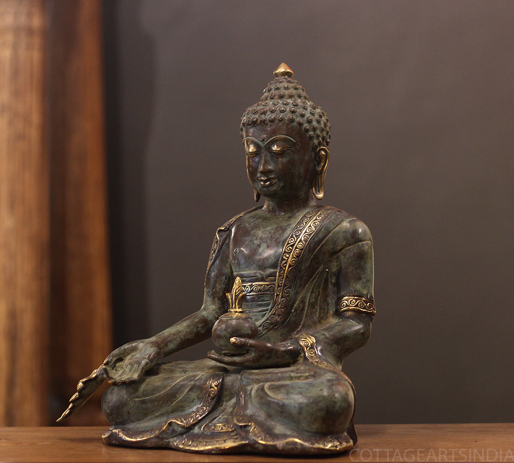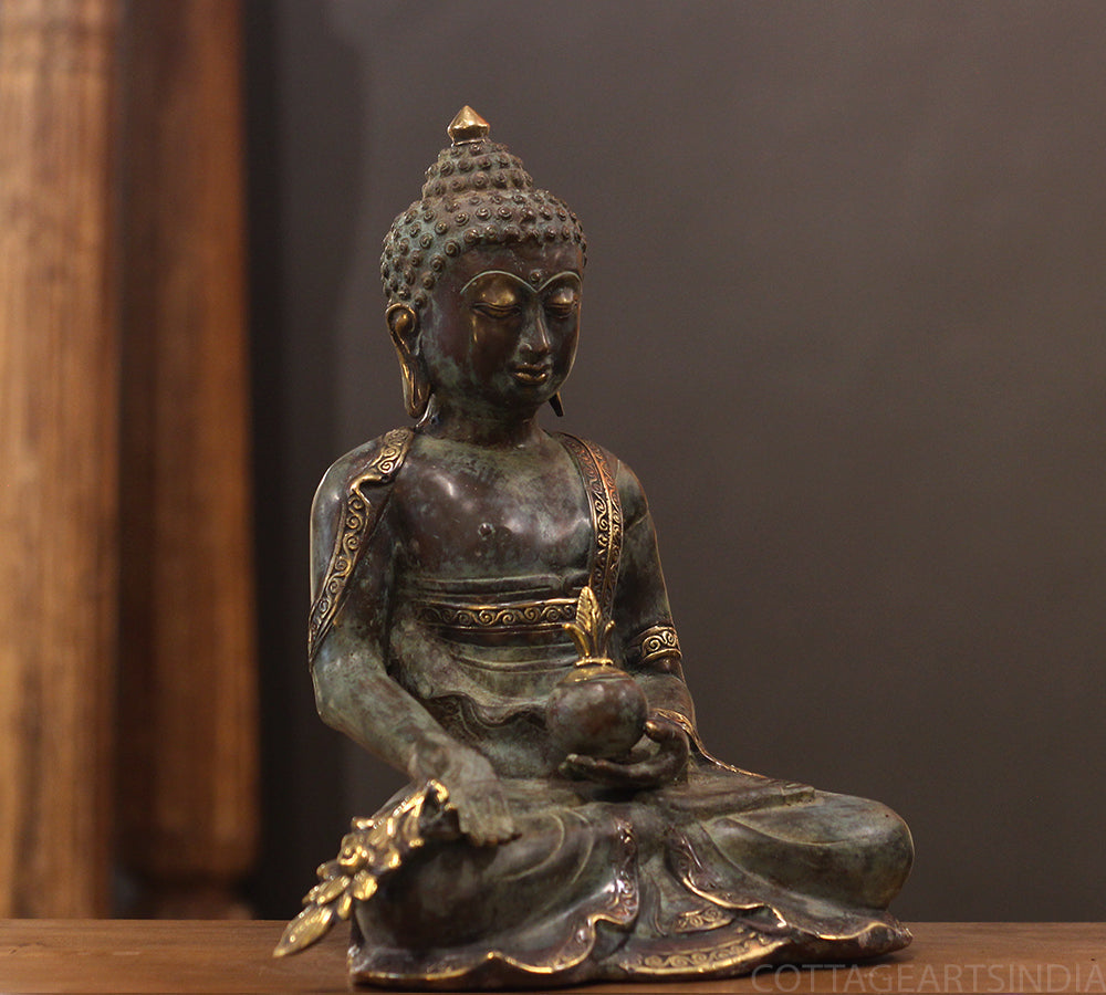 This serene Indonesian bronze sculpture represents the Medicine Buddha (Bhaisajyaguru), the embodiment of healing, wisdom, and compassion. Seated in a meditative posture, the Buddha holds a vase of healing nectar — a symbol of spiritual and physical well-being — while his tranquil expression radiates inner peace and enlightenment.