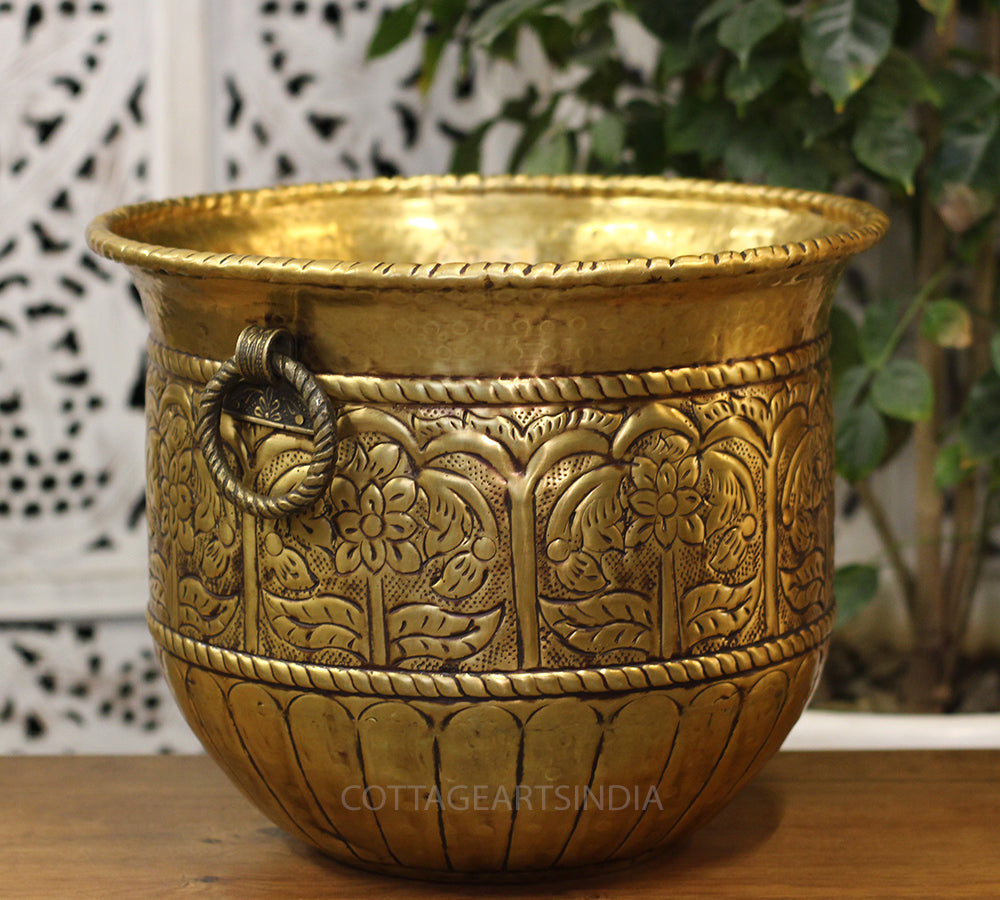 Adding character to your space, these brass antique color planters are hand-etched to showcase your favorite plants and bring a touch of elegance to your home décor.
