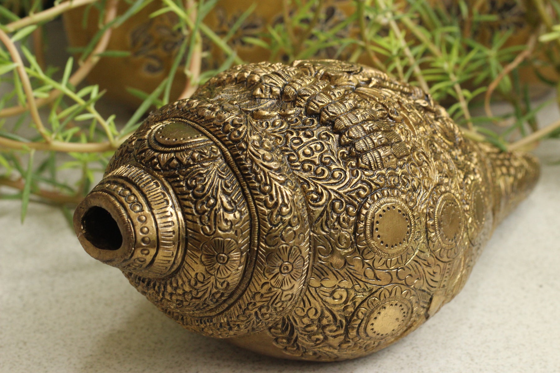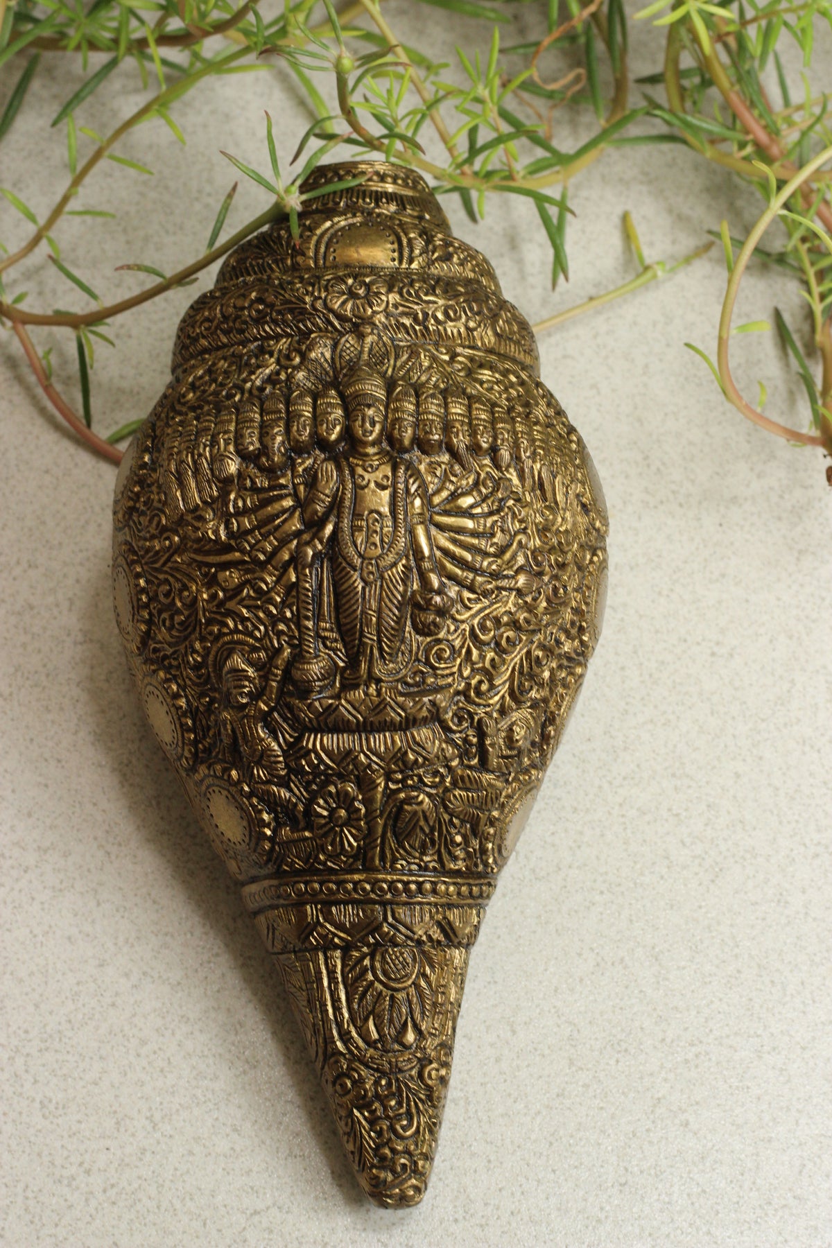 Brass shankha in finely carved solid brass  ,Brass Shank has been crafted using antique brass and comes with highly detailed engravings of Vishnu on the structure