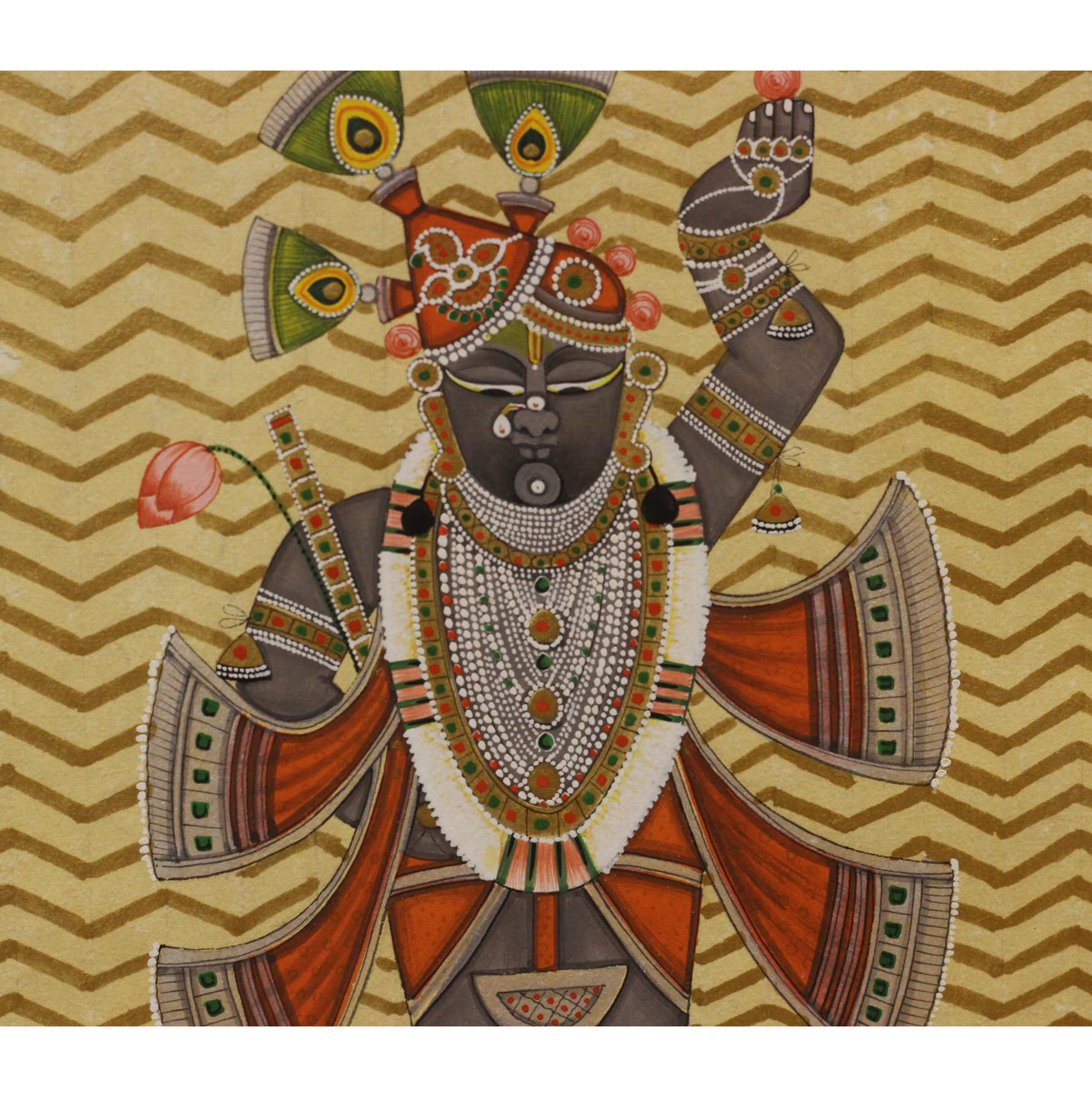 The artwork is finely painted on paper with delicate detailing and shimmering gold accents that highlight the ornaments, garments, and decorative motifs.