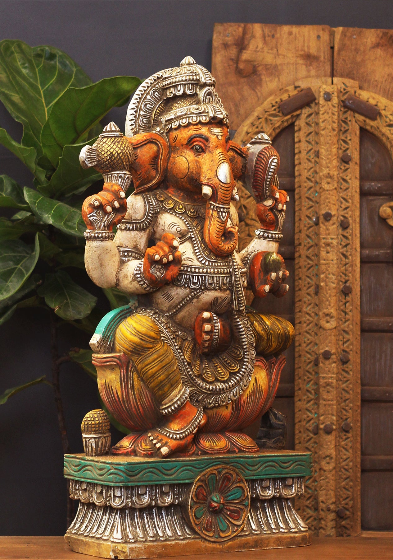 The Wooden hand carved painted sculpture of Lord Ganesha with fully sculptured from back
