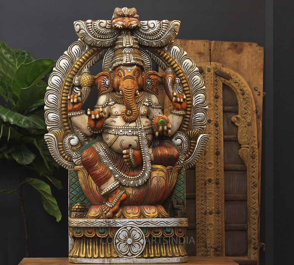 The Wooden hand carved painted sculpture of Lord Ganesha with fully sculptured from back